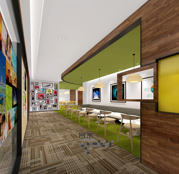 接待区域的设计:设计师在设计的时候,将其打造成一个宁静、惬意的空间,在设计师看来这样的空间设计,可以拉近与学生家长之间的关系,以此促进进一步的交流与了解,设计师希望通过这样的设计,为下一步的合作打造一个具有交流属性的空间。