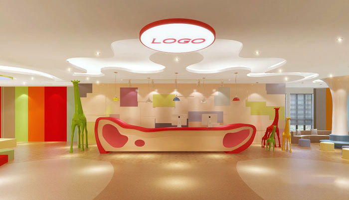 前台的设计:设计师在设计的时候,以企业的属性为设计重点,在色彩的选用中沿用了具有明确标示的儿童色彩,以此向客户传达一个明确的企业属性,同时将LOGO设置在顶部的吊顶之上,以此弥补儿童色彩中无法嵌入LOGO的缺憾,并在设计的时候有意识的将客户的眼光引向顶部,透过柔柔的灯光为企业LOGO的展现,提供了一个创意的展示平台。