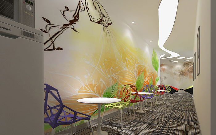 过道区域的设计,设计师在设计的时候,重点在于如何充分将空间利用起来,在设计师看来,空间是无法改变的,但是设计就是为了将空间充分利用而存在的,设计师将接待桌椅呈一条线排列,设计师希望在将空间开发的同时,可以为空间增添新的属性。