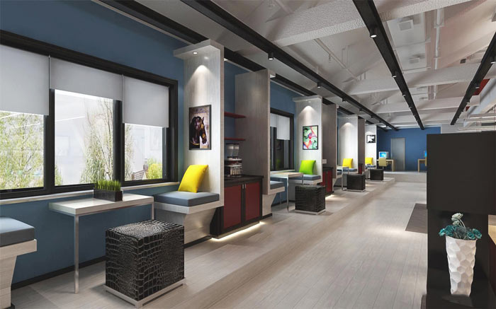 接待区域、休息区域、交流区域三位一体的设计,设计师在设计的时候,将三个空间相互糅合形成一个全新的空间,同时被设计师压缩在空间中,形成空间的一道独特的风景线,既有效的节约了成本,同时又很好的将空间运用到极致。