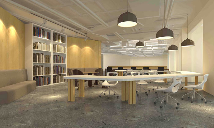 会议室、书吧的设计,设计师在设计的时候,将两个融合在一起,形成一个既可以学习、又可以总结的双重属性的空间,在设计师看来读书与学习是进步的重要途径,设计师希望员工在学习中不断的总结自己,在企业的发展中不断的完善自己。