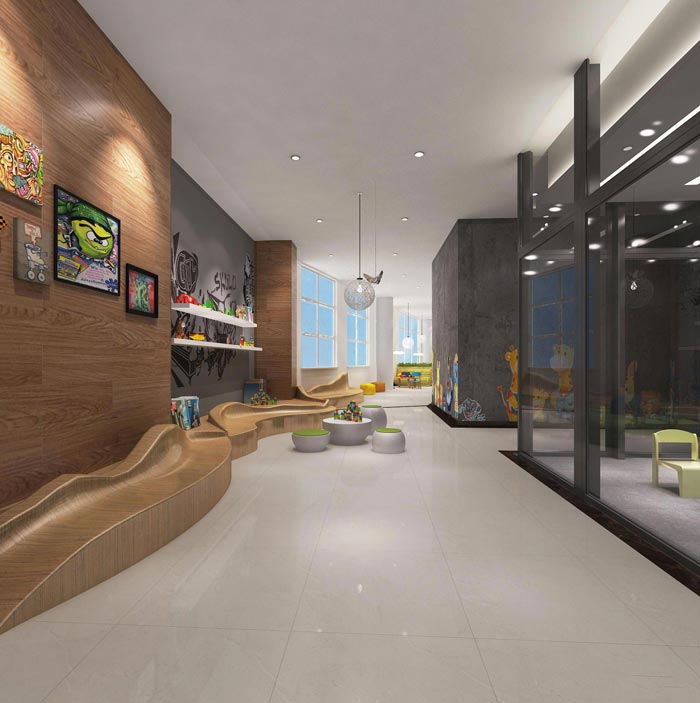 过道的设计,设计师在设计的时候,采用漫步的丛林对空间进行布置与设计,在设计师看来过道是客户了解企业的重要过程,在此处有众多开发智力、培养兴趣的设计,设计师希望让客户感受到企业的责任与实力。