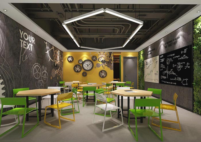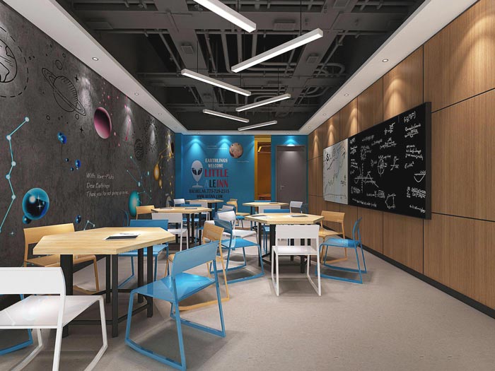 教室的设计,设计师在设计教室的时候采用不同的设计风格,避免出现千篇一律的设计,设计师认为千篇一律的设计反而会影响整个空间,让空间变得杂乱不堪,所以设计师将每个区域设计成新的风格,以此表现企业寻找孩子兴趣点教学的决心。