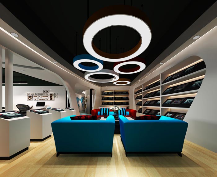 洽谈区域的设计,设计师在设计的时候,以洽谈与展示为主要的两个方面,展示区域包围着洽谈区域,在展示自身企业文化的同时,以半包围的方式给客户以温馨、舒适的空间氛围,为接下来的洽谈起到铺垫作用。