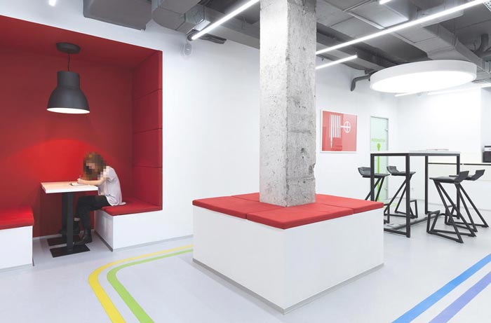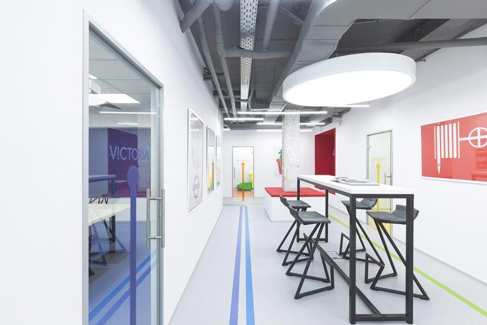 培训机构办公室吧台桌设计:设计师将吧台桌安置于过道的中心区域,这样设计的目的就是为过道增加新的属性,此处是休息区域的延伸,设计师希望为空间带来更多的人性化设计,让学员可以在此处学习、交流,让家长可以在此处休息同时观察认识学院的教学实力。