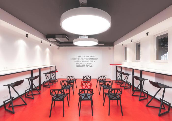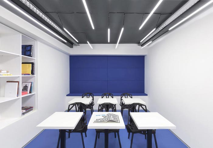 培训机构办公室教室设计:设计师希望为学员打造一个新型的课堂,因为在设计师看来若是采用和小学、中学、大学一样的教室,那么在一定程度上会引起学员的反感,因为那样的效果是千篇一律的,故此设计师采用了去教课桌的设计手法,设计师希望以此培养学员自身的自制力。