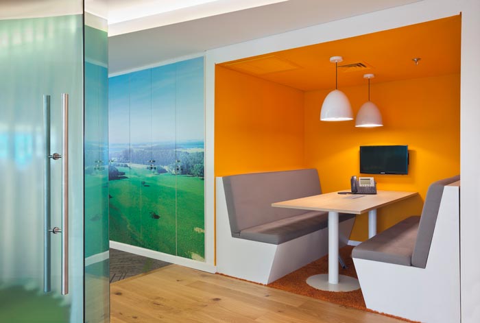 会议室的设计:设计师在设计的时候,将其安置在靠近窗户的空间区域中,在设计师看来会议是企业发展所不可替的,但是设计师希望可以改变会议室给人枯燥、无味的感觉,故此设计师将采光、室外景色通过设计的手法将其引入室内,让会议变得有趣起来。