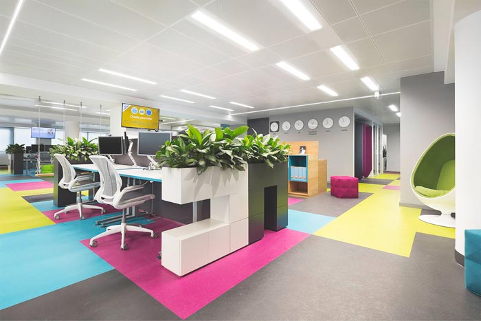 网络公司办公室办公区设计:开放式办公场所也有其缺点,设计师在设计中采用分而治之的手法,将每个空间都单独设计在一个区域,以此形成的办公空间既有开放的环境又有独立的空间。