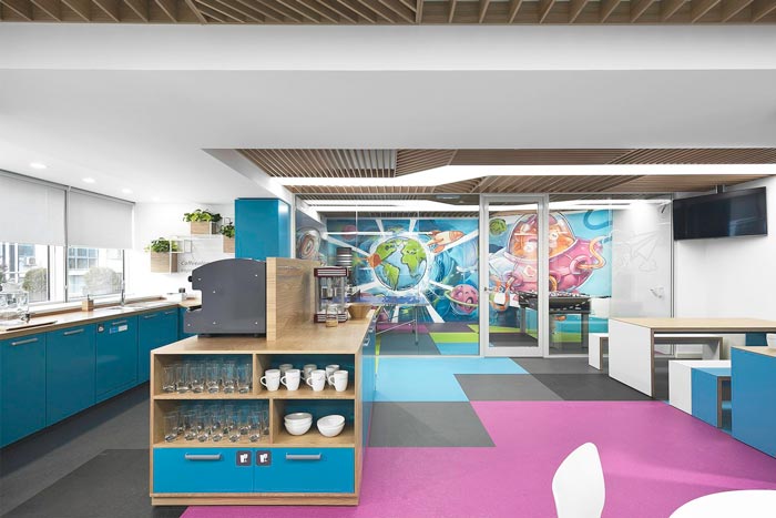 网络公司办公室茶水间设计:设计师在设计的时候,将休息区域与娱乐区域安置在其中,在设计师看来茶水间是员工一个理想的休息场所,在此地员工可以相互进行交流增进感情,以此来消除繁重的工作压力,迎来内心的空灵。