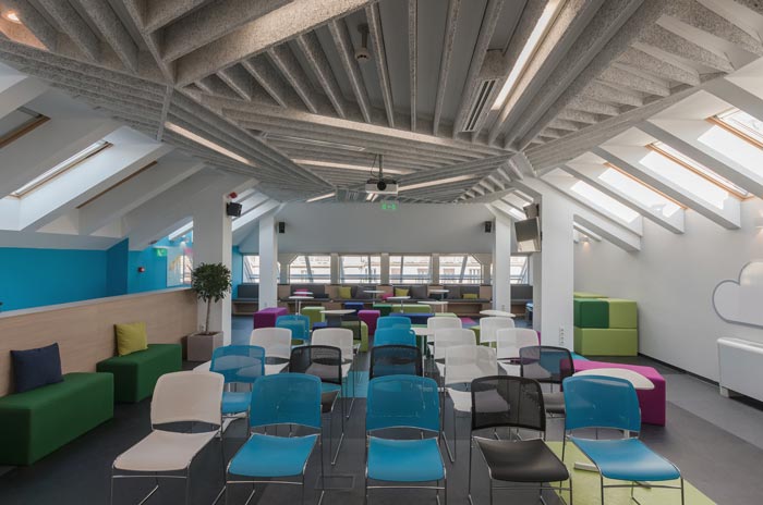 旅游门户办公室培训区设计:此处的培训区域不只是针对企业内部,同时也是针对客户旅行前的培训,设计师在设计的时候,重点考虑的问题就是,如何在有限的空间之中,将容纳扩大化。