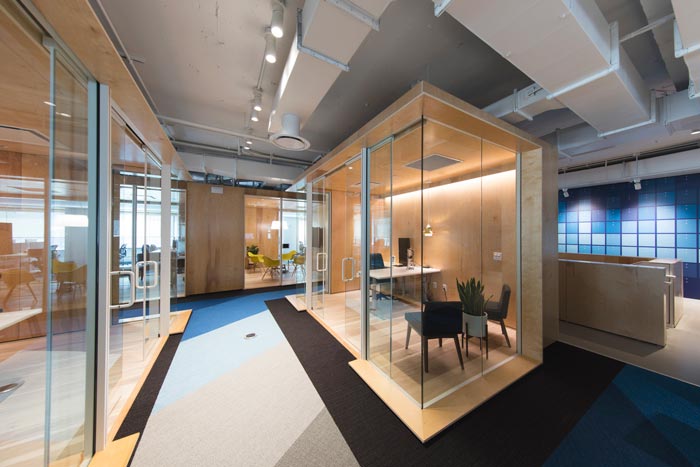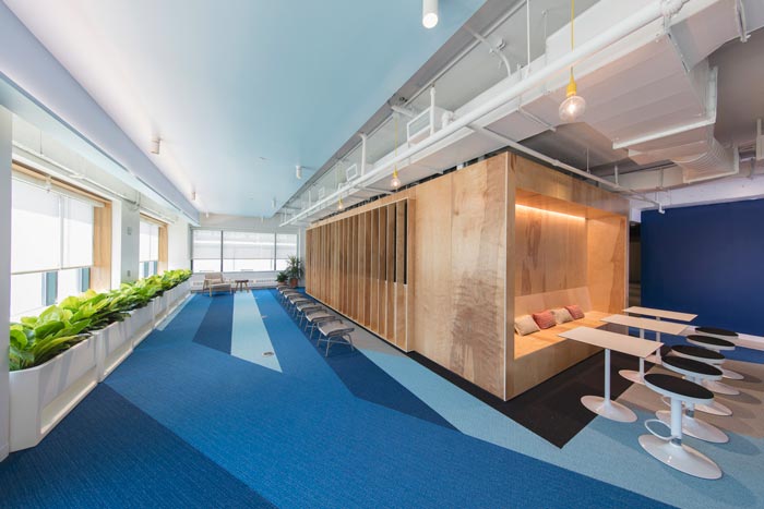 网络公司办公室动线设计:设计师在设计的时候,考虑到此处空间地处空间的内侧,故此让光源可以投入此处空间之中,动线的设计也采用不同的色彩进行表现,设计师希望通过这样的设计增加空间的通畅与方便。