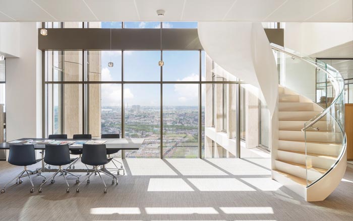 小型会议室的设计:在我们的想法之中,会议室一般都是封闭式的,但是设计师在此处偏偏采用了开放式,这是因为设计师希望通过空间来化解人与人之间的压力,并通过美景来冲散心中淤积的心事,在这样的空间中,人的思路会越来越清晰。