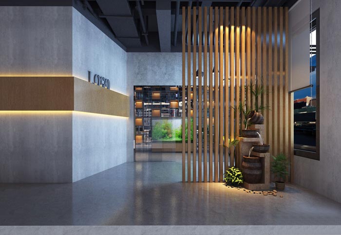 前台空间的设计,设计师在设计的时候,省略了前台的设计,设计师认为在这样的空间中,设置前台对于空间来说是一种负担,最后设计师以泉水流淌不息的艺术作品,来表现企业生生不息的企业属性。