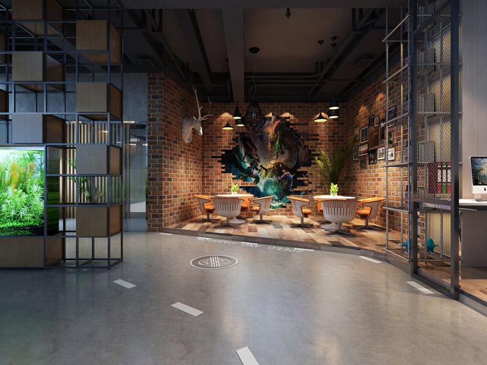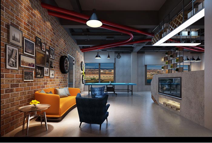 休息区域、茶水间的设计,设计师在设计的时候,将其安置在一起,两两融合的空间使空间的作用发挥到最大,工业风的注入为空间带来了惬意、舒适的空间氛围,让员工在休息之余可以感受到来自企业的关心与爱护。