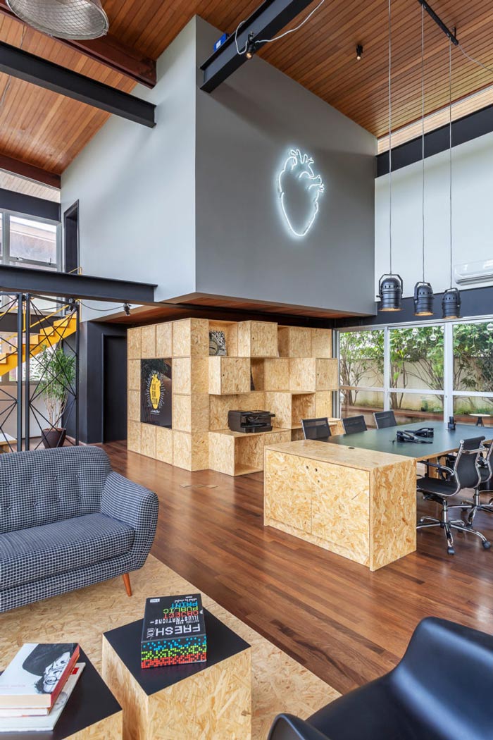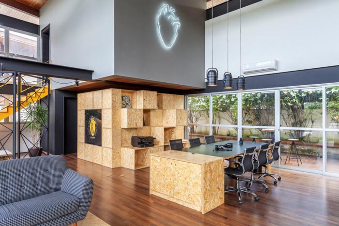 loft风格办公室储物柜设计:储物柜、魔方采用的都是压缩木材,设计师这样做也是希望将环保引入室内,压缩木材的好处就是质地坚硬、密度大、强度高,这样在环保的同时也保证产品的质量。