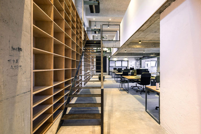 loft风格办公室楼梯区设计:设计师为了避免楼梯对整个空间带来影响,故此在设计的时候选用木材楼梯,这样既可以节约成本,又可以最大层度的释放空间的面积。