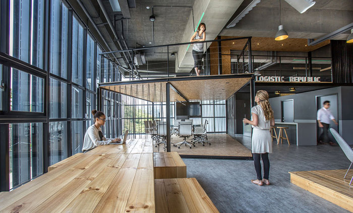 LOFT风格办公室进门区设计:物流公司的业务主要就是取与送,所以在先天上就会十分在意路线的构建,整个空间也同样如此,设计师通过上下结构的错差,让空间在错落之间寻求一种平衡。