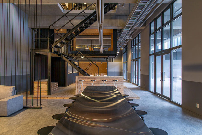 LOFT风格办公室办公区设计:二楼被设计师分为左右两边,且两边没有任何交集,中间被几十公分的空隙隔离,设计师希望让相互之间产生一丝距离,正所谓距离产生美,彼此之间留有一点点距离也是挺美好的。