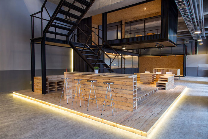 LOFT风格办公室大厅设计:在办公室一楼设计中,设计师基本上采用的都是辅助性设计,例如接待区、吧台区、休息区,楼梯曲折向上让人对上部空间产生好奇,一楼的设计也为企业接待客户提供各种可能。