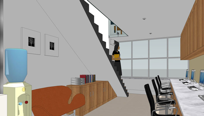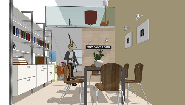 进门区域的设计:由于建筑本身的面积限制,设计师在设计的时候将进门区域直接设计为接待空间,一则利用建筑本身的特点为客企业打造舒适、放松的接待空间,二则对空间进行合理的划分。