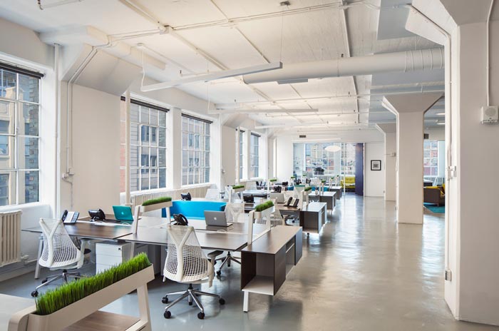 办公区域的设计:设计师以两人一排、四人一组为基础模型,在组与组之间预留了将近1米的过道空间,目的就是为了满足办公的同时,为每一个员工预留足够的活动空间,这样设计还有一个目的,就是让每一个办公工位与窗户平行,保证空间的光源足够充足。
