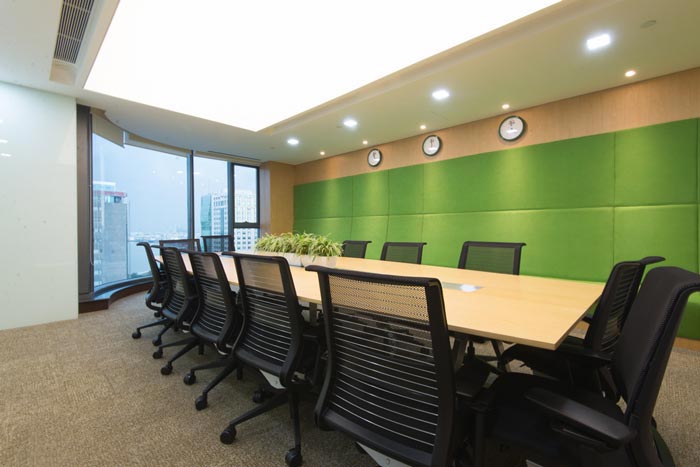 前台的设计:设计师在实地考察的时候,特别重视挖掘每一个空间的优势,此处面朝南采光极好,在设计师看来一个明亮的前台,对于企业来说也是一个好的象征,阳光通过不断的折射化为柔光透过窗户射入室内,刚好与地面的绿植地毯映衬在一起,瞬间改变了空间的特性,让空间自然、大气、敞亮。