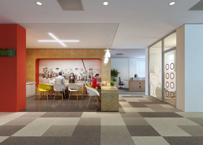 前台的设计,设计师在设计的时候,以色彩+图像的设计让空间仿佛活起来一般,这样的空间给人如初生的太阳般朝气,让客户感受到企业的勃勃朝气。