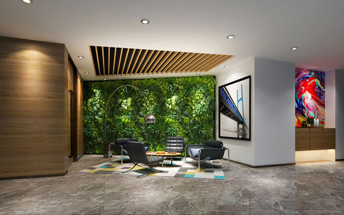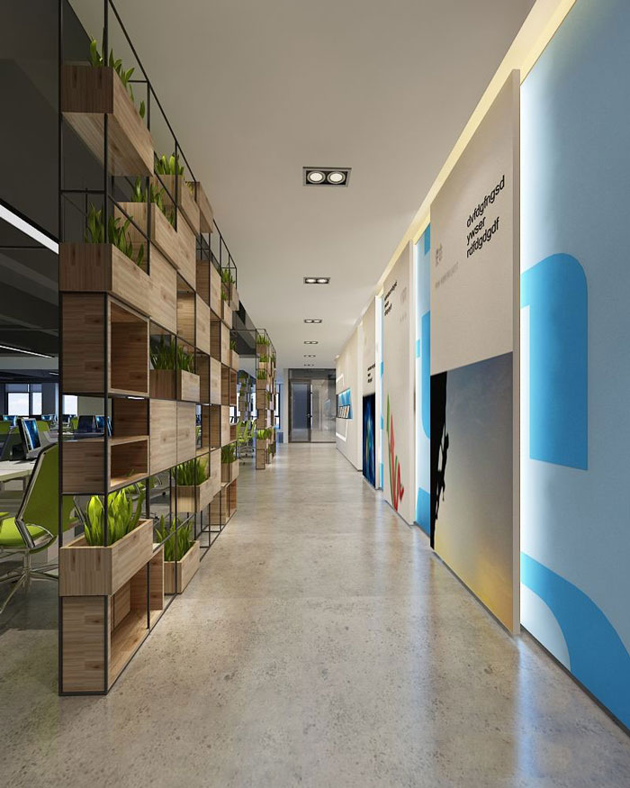 过道的设计,设计的一大亮点是绿植与木材搭建的隔断,一则时尚,二则创新,为空间带了各种新颖的元素。