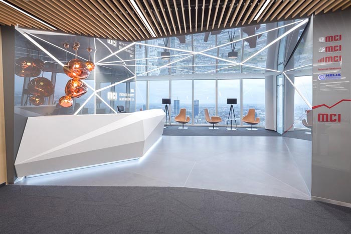 简约前台设计:在前台与进门区域之间隔着一条动线,目的就是希望起到缓冲与内部连接的作用,前台的摆放方位与进门区域互成夹角,当客户进入后前台人员可以第一时间发现,接待区域被设计师安置在落地窗附近,俯视这个城市会让人的心情更加开阔,同时也在展现企业的实力。