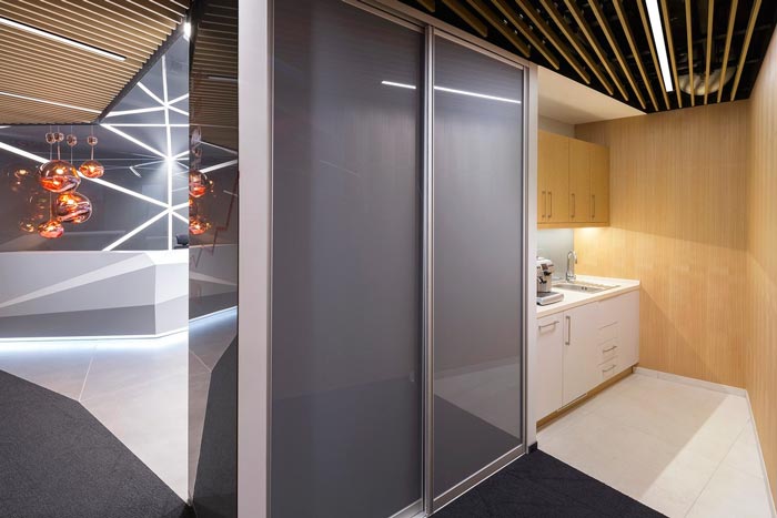 茶水间设计:此处与前台相邻,是前台与办公空间的过渡区域,在设计中设计师想过很多不同的方案,目的就是此处应该如何利用,最后以茶水间做为最终方案,目的就是一来满足接待客户之用,二来将此处加以利用,让两个空间可以相互互补。