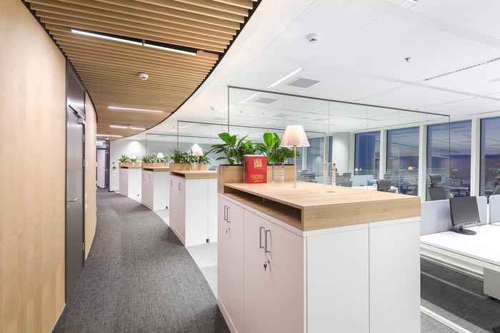 动线设计:一个弧形的动线贯穿整个空间,设计师在设计中也进行过动线直行推演,在最后发现如果动线以直线贯穿整个空间,就会压缩左边区域的办公面积,故此设计师在再三考虑之后,直接将直线勾勒成弧形,以此挤压右边空间,以此达到左右之间的平衡。