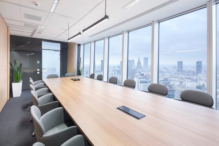 会议室设计:在门的设计上设计师采用单扇门,目的就是为了有效的阻隔室内与空间之外的联系,还企业一个安静、清静的会议空间,同时经过减弱与外部空间的联系,会让员工可以更加静下心来努力的讨论与思考,落地窗外美丽的城市风景,让员工在会议之余可以俯视整个城市,以此提升自己看问题的角度。
