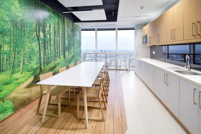 茶水间设计:此处与会议室只有一墙之隔,茶水间与休息区域的结合已经成为常态,设计师在设计中希望将自然引入室内,在思考当中最后将目标锁定在墙绘之上,自然景色最好的代表就是森林,墙壁上的羊肠小道与森林结合在一起,给人一种心旷神怡的感觉,吧台的设计,让人可以俯视整个城市,以此提升自己的心境,毕竟站得高、看得远。