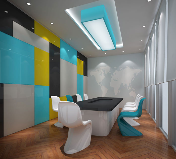 会议室的设计,设计师在设计的时候,空间采用白色、蓝色、黑色、黄色相结合的方式对空间进行设计,一则色彩之间的融合使空间创意无限,二则为企业打造优质的会议环境。