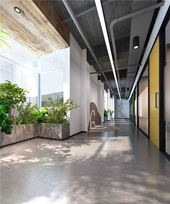 办公区域的设计:设计师在设计的时候,用展示隔断对空间进行隔离,在摆放绿植、文件的同时,是的空间具备分离、自然的双重属性。