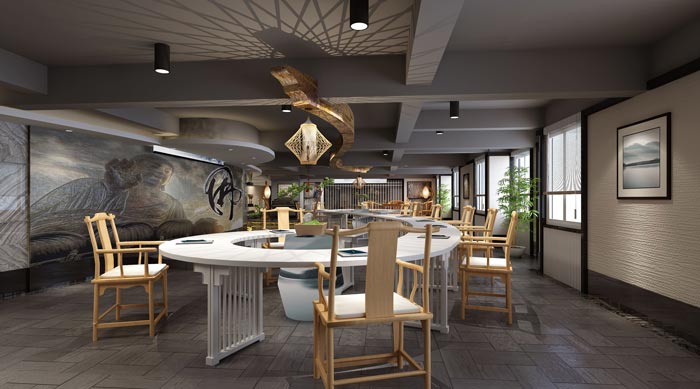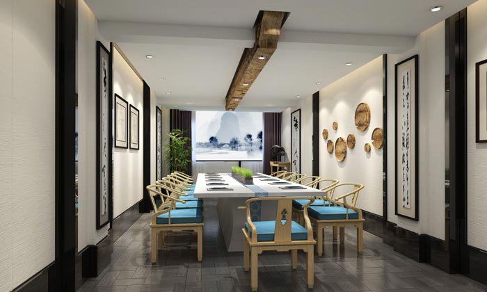 会议室的设计:中式风格本身就是古人对于自然的理解,也是古人对于为人处世具象化的一种表现,故此设计师希望中式的布局可以为企业带来一次心灵的升华,严谨的空间布局、沉稳的空间氛围尽显古人严谨的作风,设计师希望员工可以继承中华文化的精髓,不断自我成长、不断在工作中寻求突破。