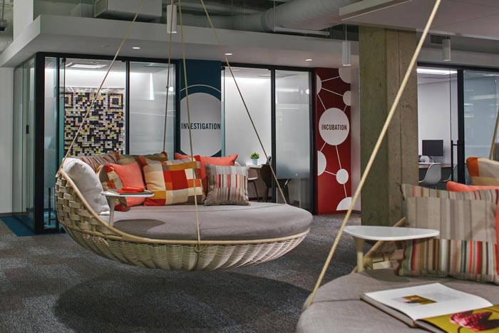 创意区域的设计:相信大家每个人小时候都荡过秋千,但是事与愿违,随着年龄的成长,这些反而很多人都不曾在接触过,在设计师看来这样是不对的,我们的成长不能抹杀我们的童心,而且设计师也相信当人在半空中摇晃的时候,往往创意的火花会蹦擦出来。