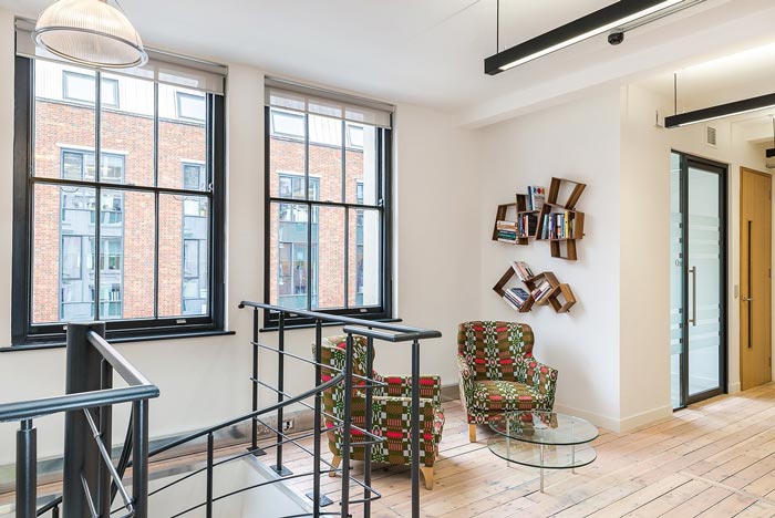 休息区域的设计:此处位于一个单独的空间之中,设计师要做的就是给企业营造一个安静的氛围,沙发按照三角形排列,这样让彼此之间交流更加方便,更多考虑到的是细节的体现,沙发的样式是向后倾斜的,让人坐在上面可以以最舒服的姿势进行交流,设计师所追求的就是人身体的释放。