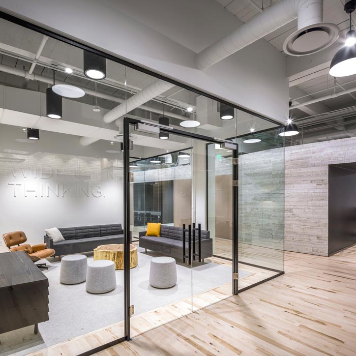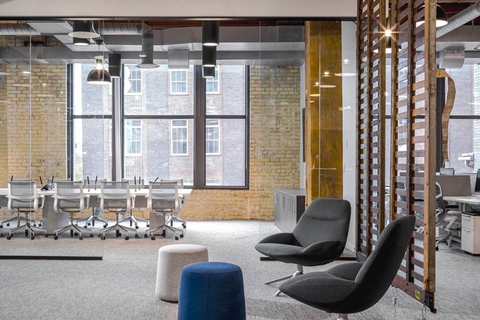 会议室的设计:长方形的会议桌占据了整个空间的中心区域,这也是设计师在企业需求、空间现状之间作出的改变,设计师的目的非常简单,就是在无法改变空间现状的前提下做出最佳的调整,为了保证与外部空间的连接,设计师采用了无门的设计,让内外之间即分离又连接。