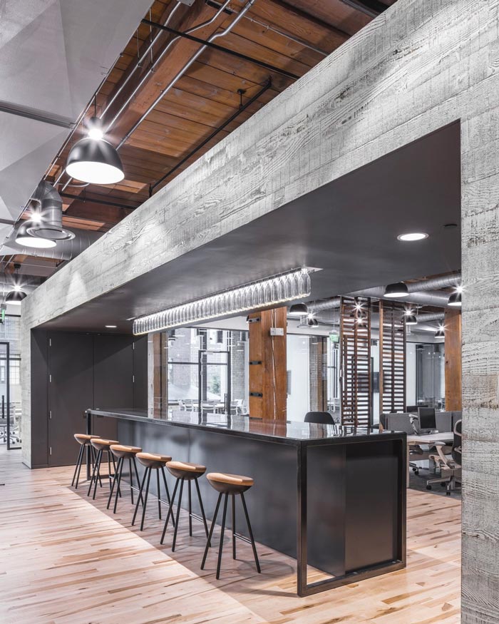 吧台区域的设计:此处位于办公空间左边,目的就是希望员工在劳累的时候,可以在此处稍作休息,喝喝咖啡体会一下不一样的感觉,同时此处起到很好的交互作用,将不同部门的员工聚集在此次,加强彼此之间的交流,增加企业内部的向心力。