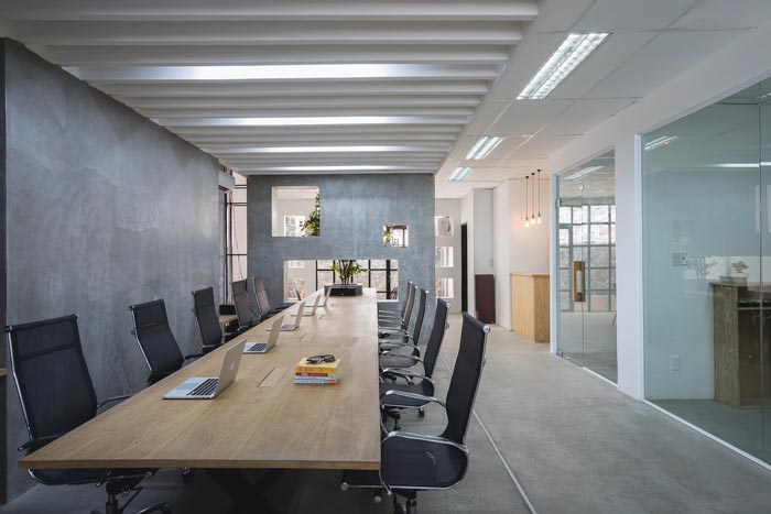 办公室会议区设计:加长版的会议桌摆放在空间之中,一个大区域就此落地,既不妨碍整个空间的运行,也可以满足企业需求,同时还可以满足员工在此处办公,一举三得、何乐而不为。