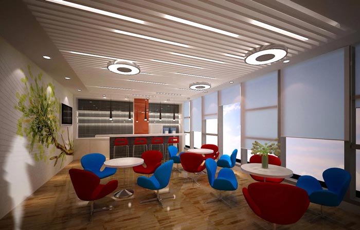 茶水间在现代办公环境中是必不可缺的,设计师在设计的时候将休息区域与茶水间相互融合,寓意:适当休息是必要的,也能体现公司管理的人性化。