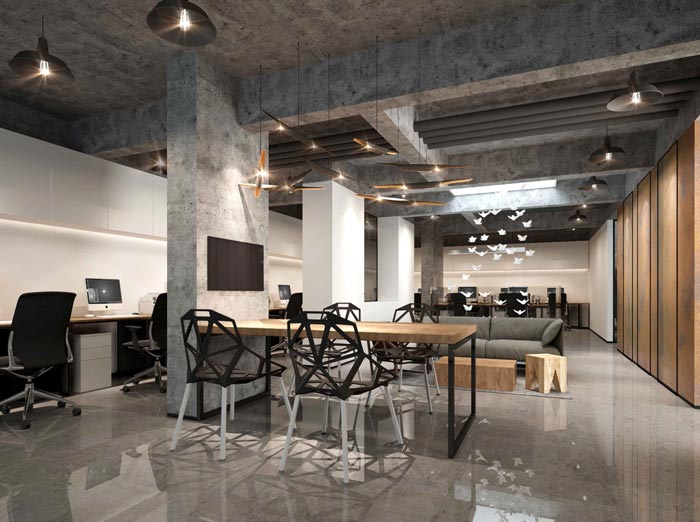 设计师依据起点零久的发展模式,也就是服装连锁店面的途径,扩大品牌的影响力,有了蜘蛛网的装修灵感,在搭配上彩色和原木色,让整个严肃的办公空间活了起来。
