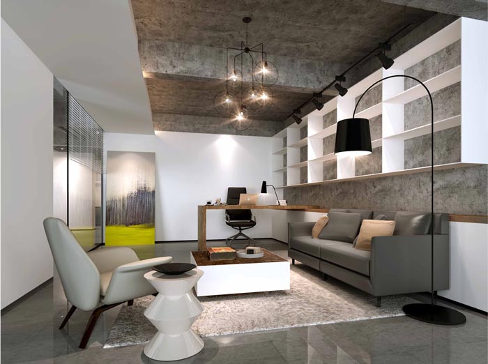 设计师在设计总经理办公室的设计,没采用白墙白顶的素白空间,设计师认为室内设计需要有些创新的元素,这样往往会有意想不到的效果出现。