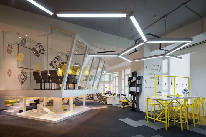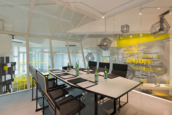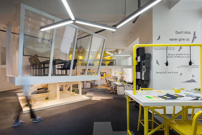 会议室的设计,设计师将其安置在空间的中心,一则做为企业的亮点存在,二则悬空的空间给人以俯视的感觉,本空间不论是内部还是外部都携带创意的属性,这样的空间使人灵感无限。