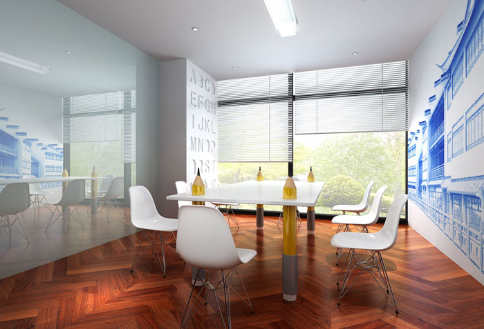 会议室的设计,设计师在设计的时候,以色彩铺垫整个空间,以地图对空间进行点缀,一则创意无限,二则说明思维的重要性。