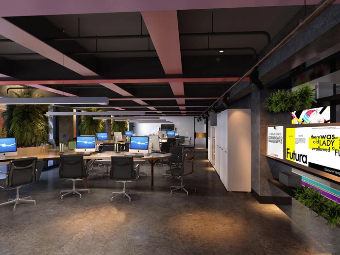 1600平方厂房办公区域:设计师在设计的时候,对空间采用开放式的设计手法,在设计的同时设计师以正反的双面设计,以此来规避开放式空间的缺点,在设计师看来空间的设计都是双方面的,有好就有坏,具体的就需要看设计师在设计的过程中如何保持平衡。