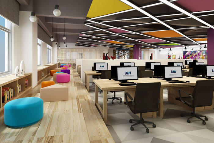 230平方儿童童装公司办公区域:设计师在设计的时候,根据企业自身的属性,在设计的时候加入了儿童元素与简约相互融合,让员工在工作的时候从客户出发,因为客户所对应的不是成人,故此更多的应该站在儿童的角度去想事情。