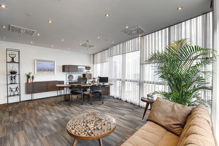 老总办公室设计:此处给人的第一感觉就是明亮、通透,在设计中设计师采用多重弱化的手法,将光进行多次重叠,进入室内后剩下的是柔柔的柔光,让人感到温暖与舒适。