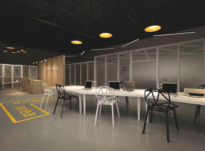 450平方设计事务所办公室前台:在设计的时候,设计师根据空间自身的特点,将空间按照8:2的比例进行切割,前台不仅让客户可以直观的认识企业,同时还保证空间在一定程度上的完整。